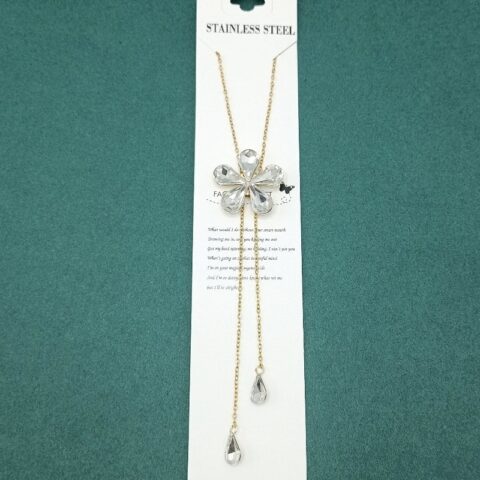 Beyaz Kristal Taşlı Asansörlü Çelik Zincirli Kolye